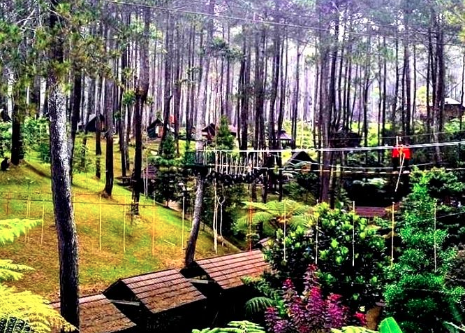 Banyak area fotogenik di antara pohon pinus, jembatan gantung, hingga area padang rumput yang sering dijadikan lokasi foto prewedding.